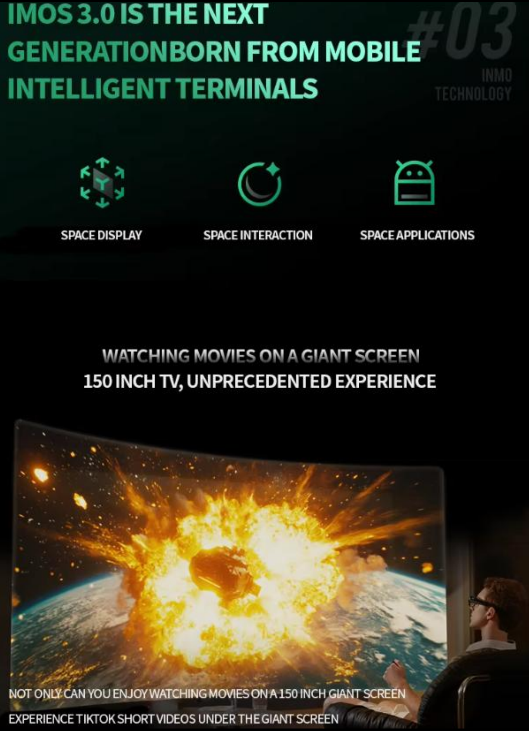 The INMO Air 3 is charged via Type-C and runs on the intuitive IMOS 2.0 operating system, delivering a fluid and user-friendly experience—making the Air 3 your ultimate companion for work, creativity, and play.
